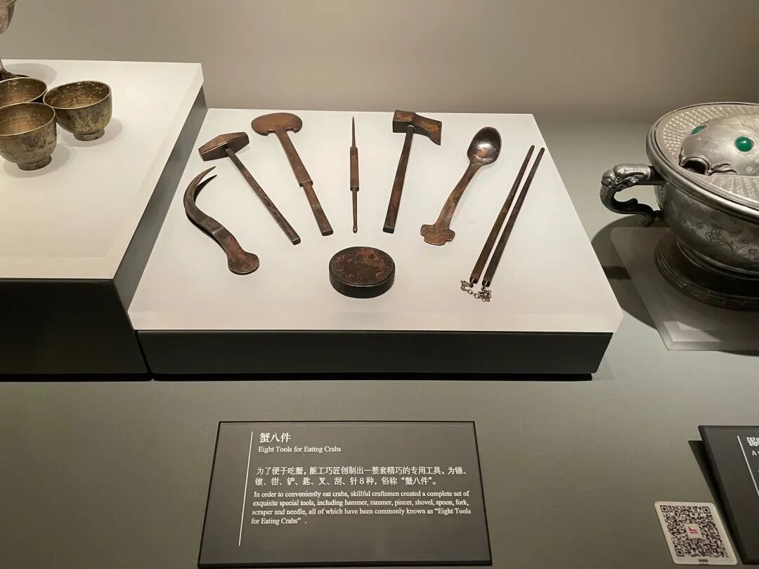 明代江南文人为吃大闸蟹,设计了“蟹八件”,由八种小工具组成,包括腰圆锤、小方桌、镊子、长柄斧、调羹、长柄叉、刮片、针等,用来拆解蟹壳、剔肉和食用蟹黄。