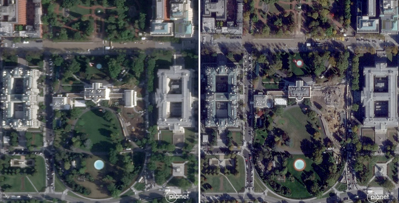 拍摄于9月26日(左)和10月23日的卫星图像对比显示,白宫东翼整体建筑已被彻底拆除。