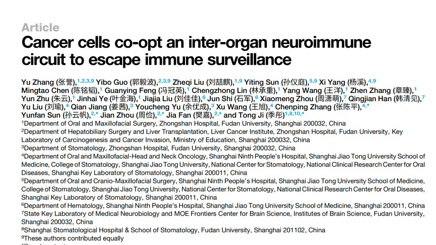 复旦大学附属中山医院季彤教授、樊嘉院士、周俭教授、孙云帆教授及上海交通大学医学院附属第九人民医院张陈平教授为本文通讯作者。复旦大学附属中山医院“卓越住院医师”临床博士后张誉博士、郭毅波博士、复旦大学附属中山医院口腔颌面外科刘喆麒博士、上海交通大学医学院附属第九人民医院孙仪庭博士及杨溪主任医师为本文共同第一作者。中国科学院脑科学与智能技术卓越创新中心蒲慕明院士为本研究提供了特别支持。
