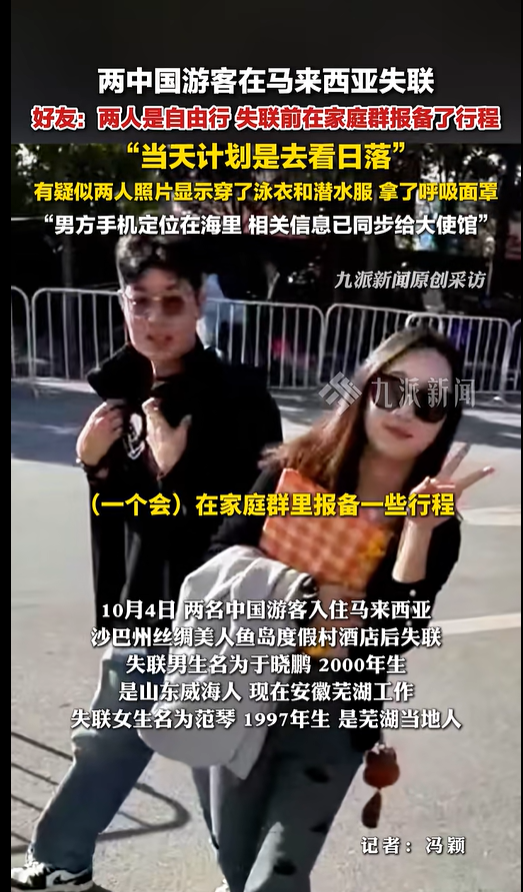 据此前媒体报道,10月4日,两名中国游客入住马来西亚沙巴州丝绸美人鱼岛度假村酒店后失联,此后双方的朋友和亲人在社交平台发文紧急寻人。
