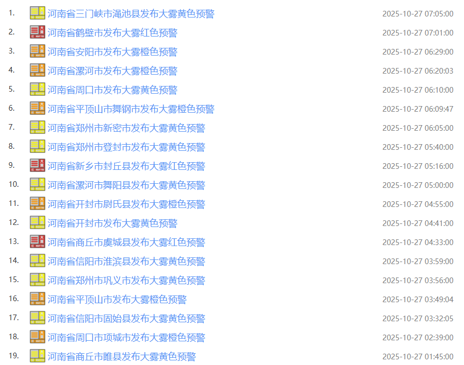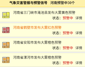 截至7:55,河南三门峡、鹤壁、安阳、漯河等地已发布大雾预警信号,有出行计划的朋友请及时关注交通信息,注意雾的变化,小心驾驶;建议有晨间活动的朋友,取消户外活动!