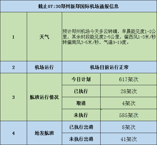 截至10月27日7:30,郑州新郑国际机场运行正常,今日计划航班617架次,已执行28架次,取消4架次。有乘机安排的朋友请提前查询您的航班信息(0371-96666)。