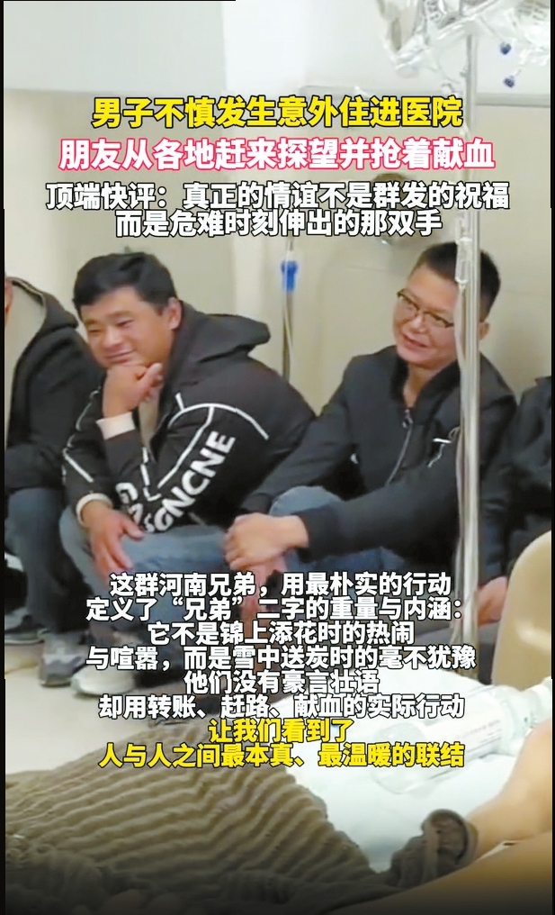 然而,这群河南兄弟,却用最朴实的行动定义了“兄弟”二字的重量与内涵:它不是锦上添花时的热闹与喧嚣,而是雪中送炭时的毫不犹豫;不是顺境中的热闹陪伴,而是绝境里的不离不弃。他们没有豪言壮语,却用转账、赶路、献血的实际行动,让我们看到了人与人之间最本真、最温暖的联结。