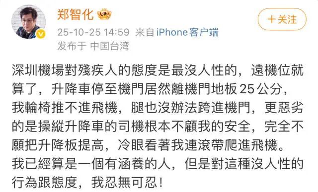 郑智化在微博控诉深圳机场对残疾人“态度最没人性”,称升降车与机舱门存在25厘米高度差,导致轮椅无法推进机舱,工作人员拒绝调整设备且“冷眼旁观”,最终他被迫“连滚带爬”登机。