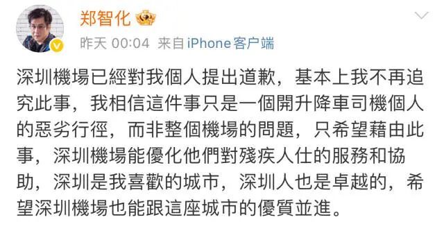 郑智化接受道歉,称事件系“个别司机恶劣行径”,呼吁优化残障服务。