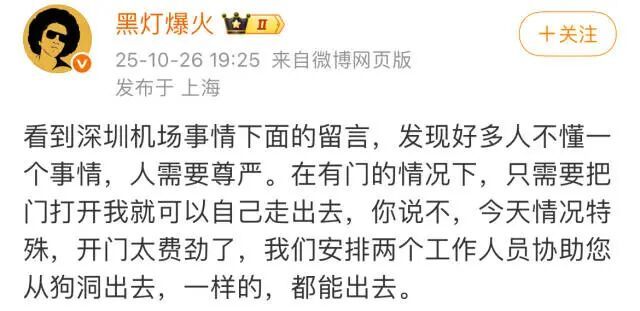 10月26日晚,脱口秀演员黑灯就此事件发表评论,发文称:“看到深圳机场事情下面的留言,发现好多人不懂一个事情,人需要尊严。在有门的情况下,只需要把门打开我就可以自己走出去,你说不,今天情况特殊,开门太费劲了,我们安排两个工作人员协助您从狗洞出去,一样的,都能出去。 ”