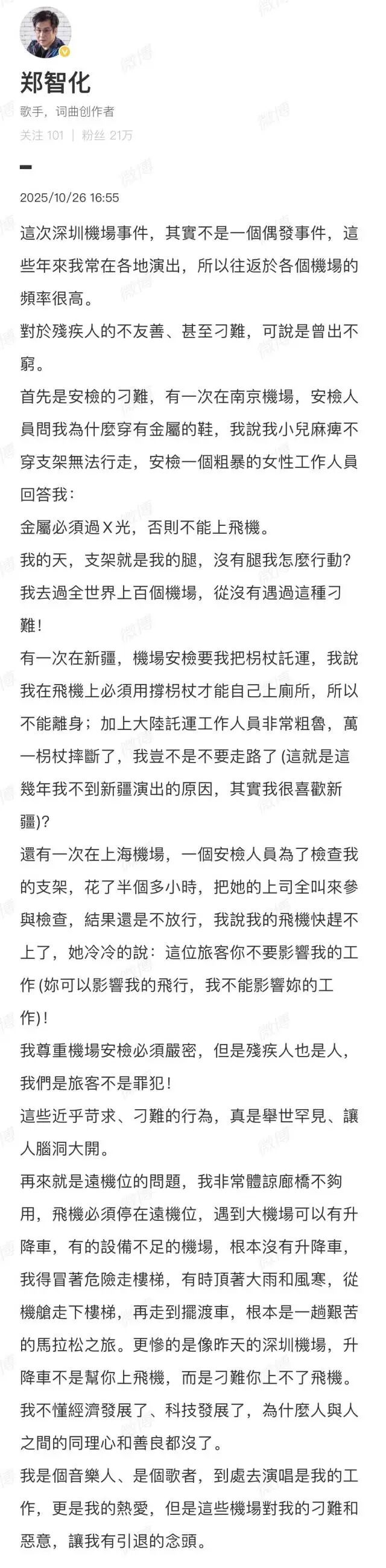 10月25日,歌手郑智化在微博发文控诉深圳机场服务存在严重问题,称其在登机时遭遇工作人员冷漠对待,最终不得不“连滚带爬”进入机舱,引发公众关注。