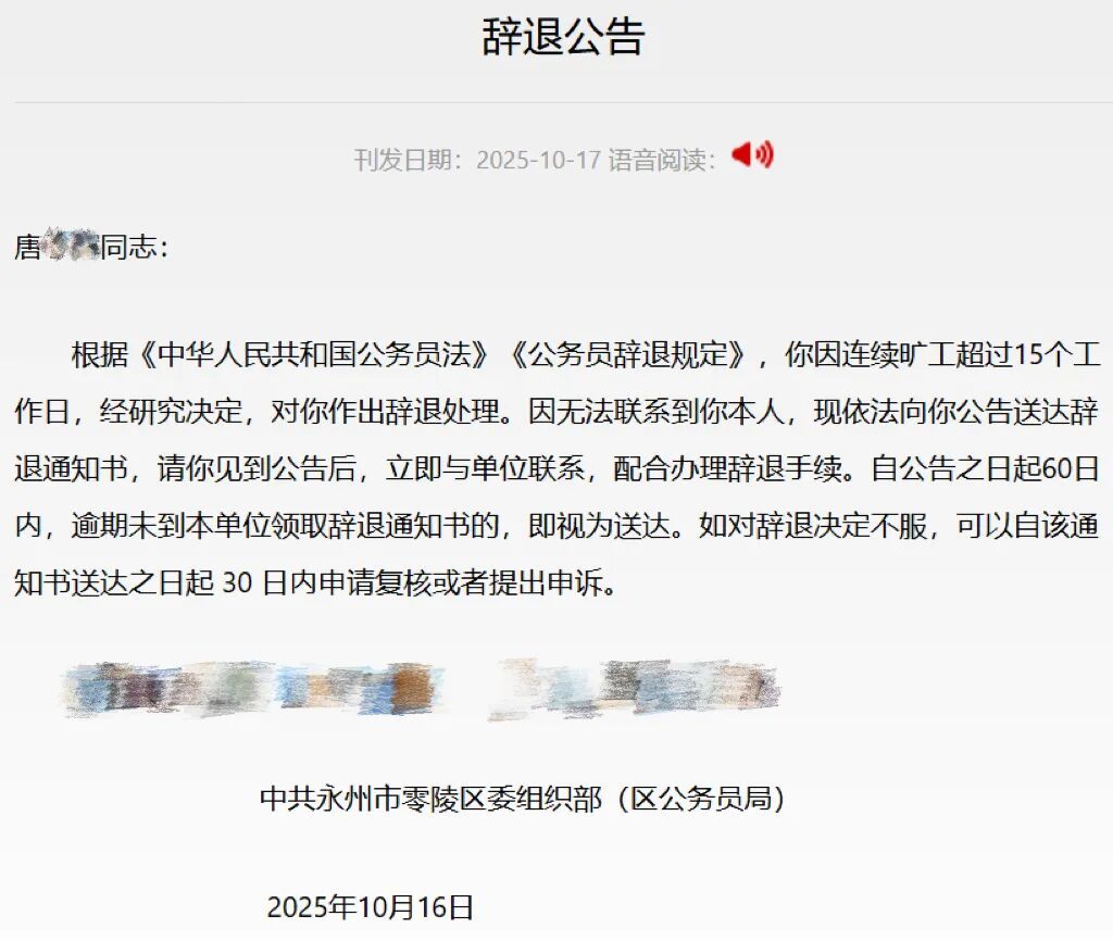 近日,湖南省永州市零陵区公务员局发布一则辞退公告称,该区公务员唐某某因连续旷工超过15个工作日,被依法予以辞退。这则看似普通的通报引发公众关注的点又在于,该公告还申明“由于无法联系到本人,采取公告形式送达辞退通知书,自公告之日起60日内,逾期未到单位领取辞退通知书的,即视为送达。如对辞退决定不服,可以自该通知书送达之日起30日内提出申诉”。