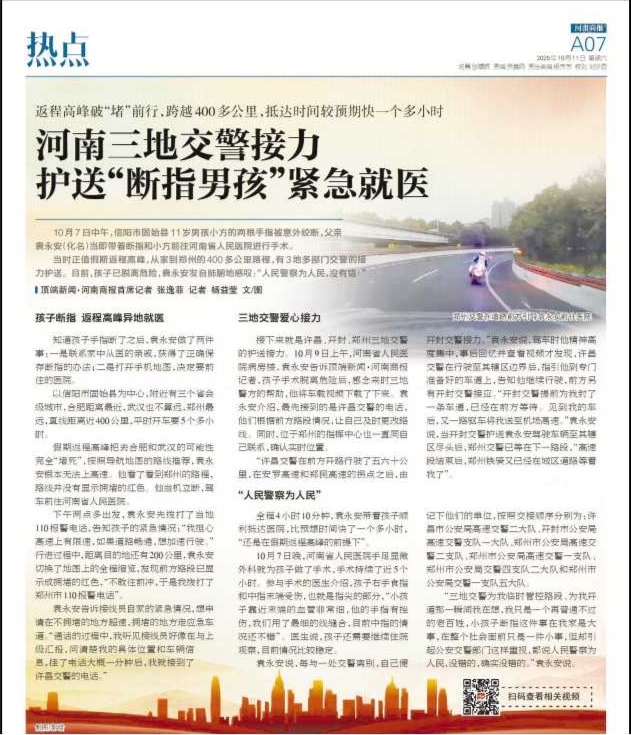 进入郑州市区后,正值国庆假期返程高峰,郑州交警一路将孩子送至河南省人民医院进行手术。交警为小袁的断指手术争取到宝贵的时间。