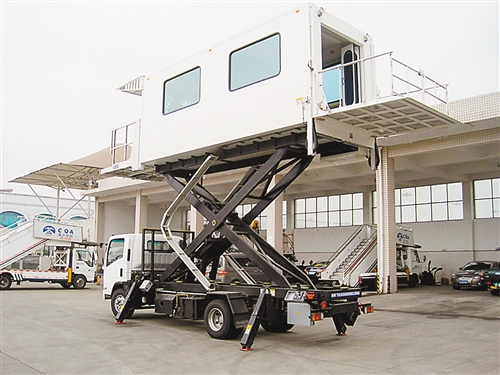 当然,郑智化所使用的并非客梯车,因为客梯车都是一级级台阶,轮椅上不来。把他送上飞机用的是一种更为少见的车型,那就是升降平台车。如果单从外形与运作模式来看的话,升降平台车其实和飞机的餐车还挺相似的,都是把车厢升高后地板与舱门口对接,进行人员来往或者运输。