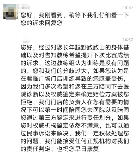 9月23日,王女士再次向前述微信用户表示,自己的康复费用修改为1.6万,“包含康复费用1.4万和医院的检查花费2000多元。”而该用户则在微信中回复称“经过对您长年越野跑跑山的身体基础以及对告知教练希望提升下次比赛成绩的诉求,这边教练组认为训练是没有问题的,您和我们的分歧过大,我们可以陪同您通过第三方鉴定来进行责任划分。”