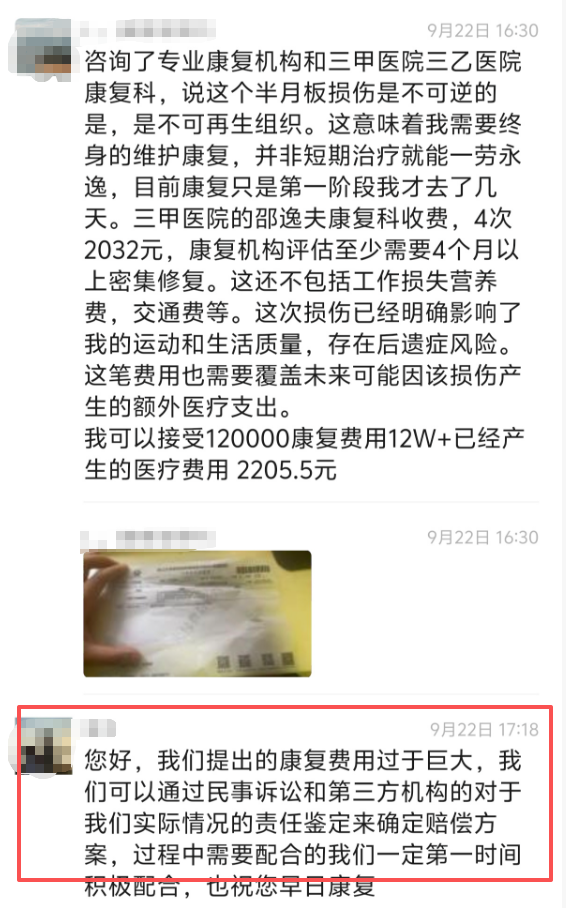 据其提供的一份聊天截图显示,9月22日,一微信用户添加了王女士好友,并自称与杭州健怪兽多家门店有管理关系。交流中,王女士曾提出自己可以接受康复费用12万+已经产生的医疗费用2205.5元。但该用户却表示,王女士一方提出的康复费用过于巨大,可以通过民事诉讼和第三方机构对于其实际情况的责任鉴定来确定赔偿方案。
