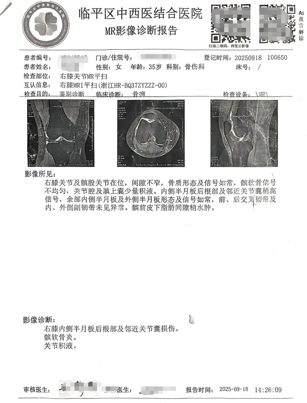 据其提供的诊断报告显示,王女士在9月18日、24日及10月2日、8日、9日、11日相继前往临平区中西医结合医院进行MR影像诊断,诊断结果为“右膝内侧半月板部及邻近关节囊损伤、髌软骨炎、关节积液、腰椎骨质增生、周围软组织轻度水肿、膝周皮肤及皮下水肿”等多部位损伤。