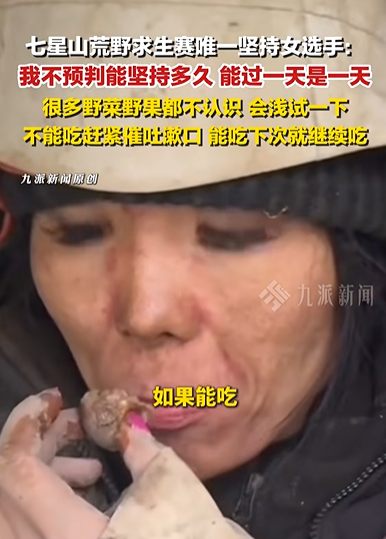 近日,七星山杯百人荒野求生挑战赛在张家界举行,选手需在极端环境下进行生存考验。已有选手因恶劣天气暂停活动,场上唯一坚持下来的女选手“冷美人”备受关注。13号选手“冷美人”参赛十几天后瘦成闪电,在山中采野果、野菜,烤蚂蚱、喝浑水充饥,手指嘴唇开裂,“灰头土脸”的样子与赛前判若两人。