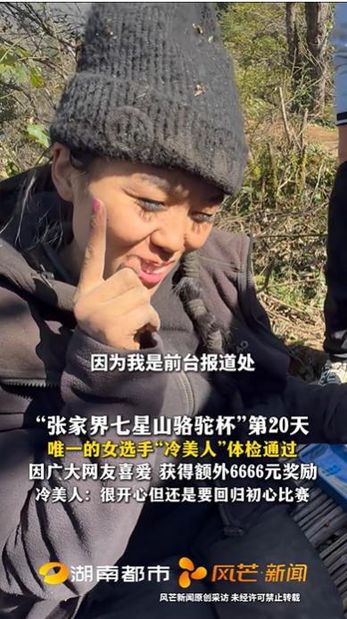 据风芒新闻消息,“张家界七星山骆驼杯”第20天,唯一的女选手“冷美人”体检通过。因广大网友喜爱,获得额外6666元奖励,“冷美人”表示很开心,但还是要回归初心比赛。