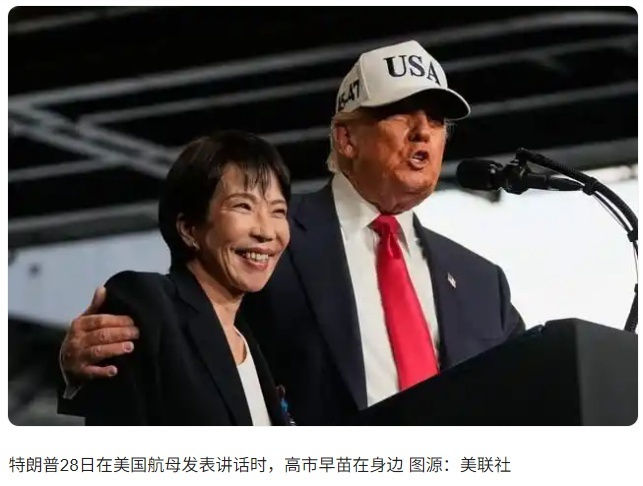 据环球时报援引美国《纽约邮报》报道,美国总统特朗普与日本首相高市早苗10月28日在日本横须贺一同登上“乔治·华盛顿”号航空母舰。特朗普在舰上发表讲话时声称,日本丰田汽车公司承诺将在美国投资100亿美元,并呼吁美军人员去购买丰田汽车。