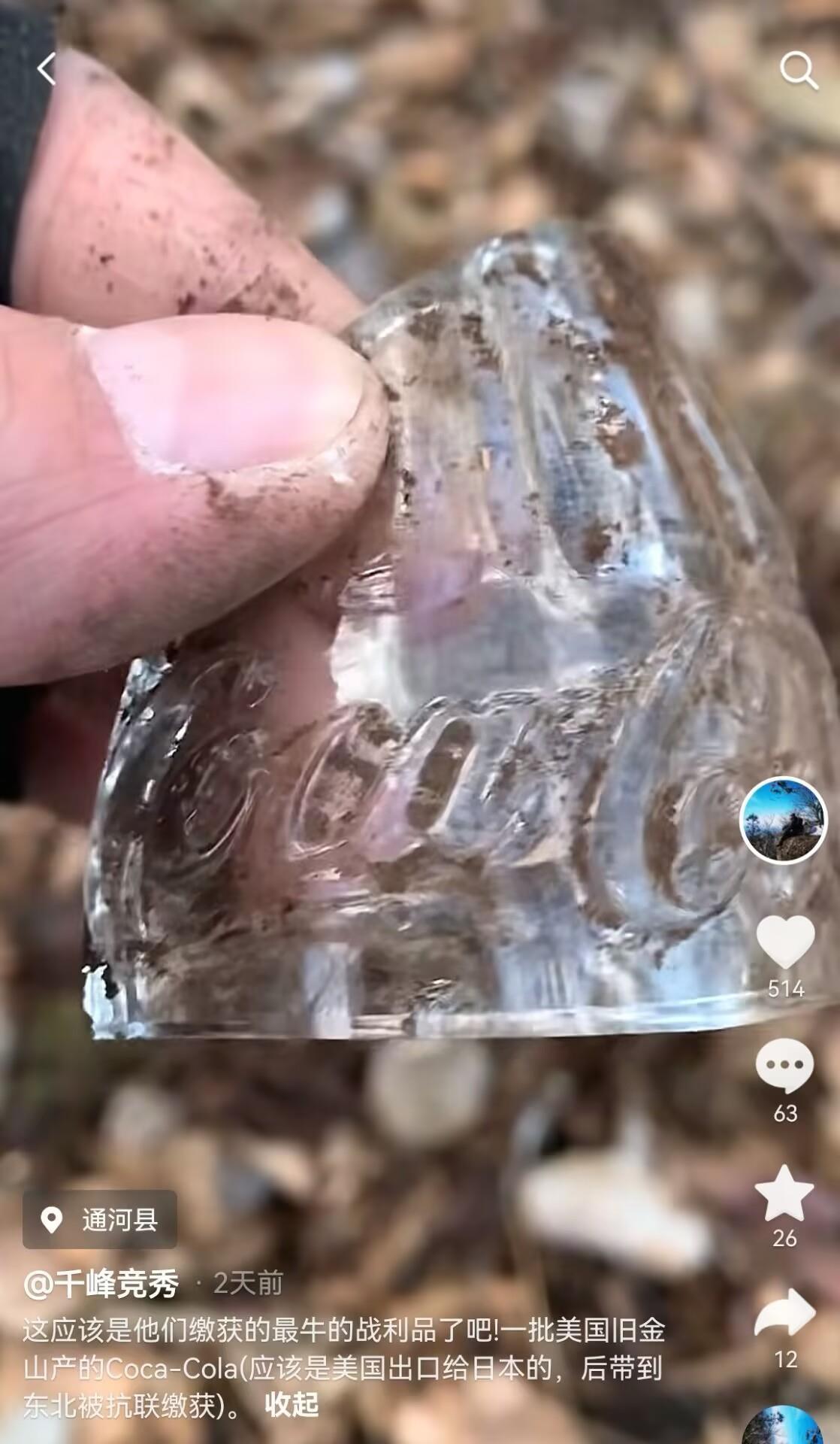 10月29日,哈尔滨市文化志愿者祁凤麟向极目新闻反映,他们此前在通河县抗联密营遗址附近发现了可口可乐玻璃瓶,可能是缴获的日军后勤物资。