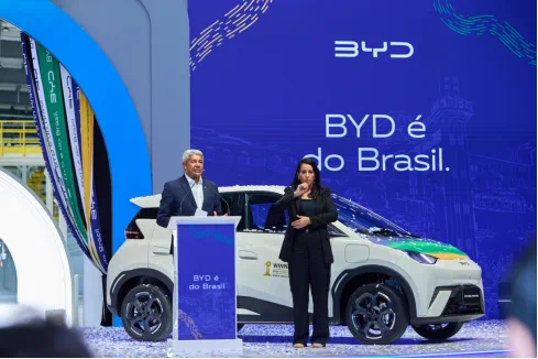 ▎当地时间2025年7月1日,比亚迪在巴西巴伊亚州卡马萨里举行巴西乘用车工厂首车下线仪式。(图源:比亚迪官网)