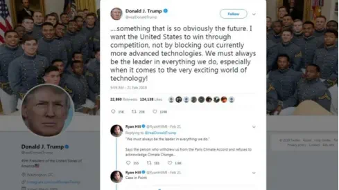 ▎美国总统特朗普的推文:美国必须是领导者,特别是科技世界的领军者。(图源:BBC)