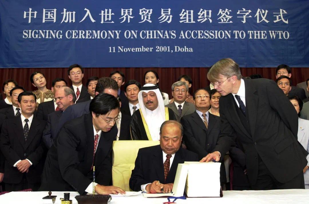 ▎2001年11月11日,卡塔尔多哈,时任对外贸易经济合作部部长石广生签署中国加入世贸组织协议。(图源:东方ic)