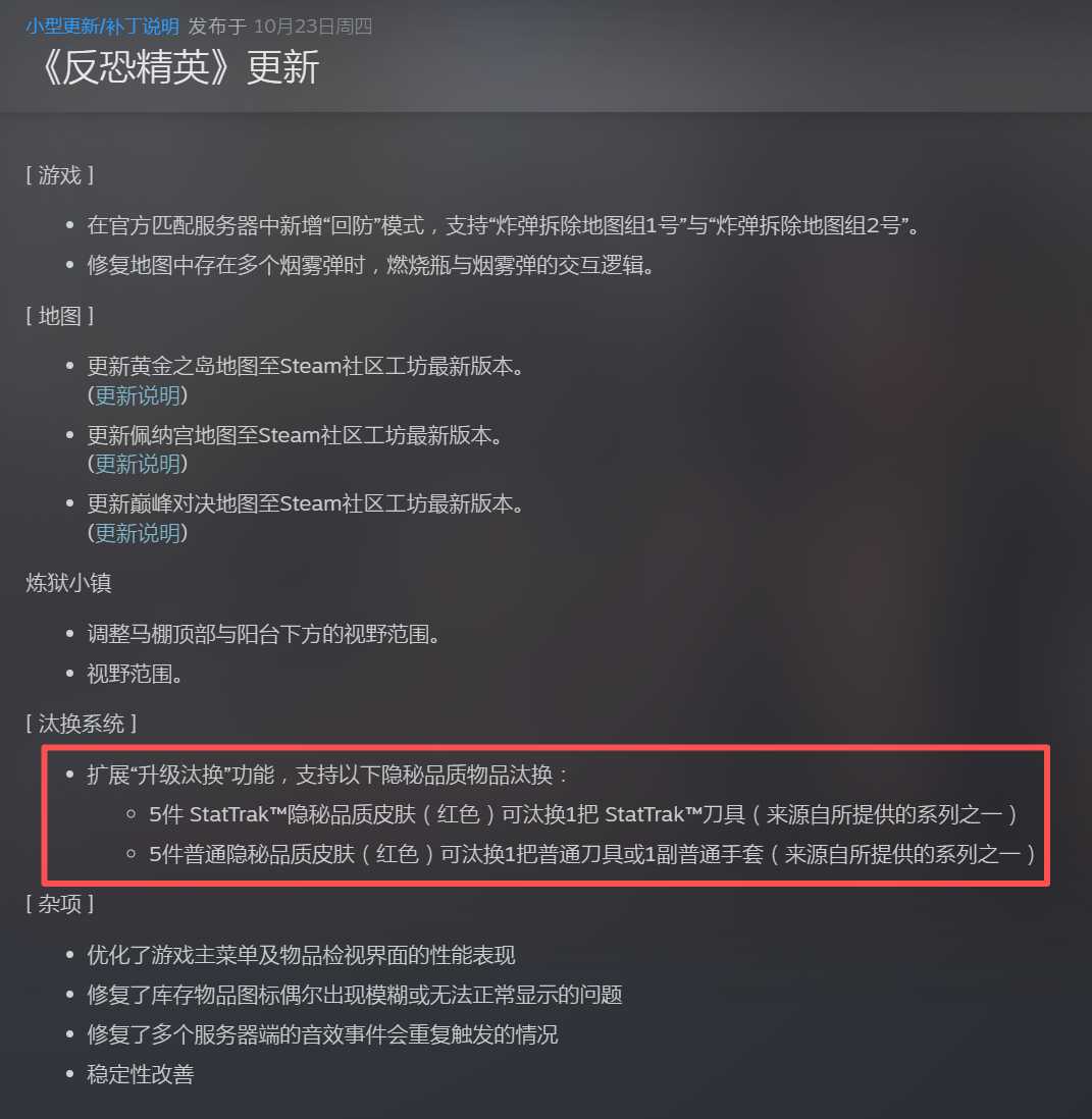 10月24日,CS2发布了一则更新公告,在常规更新之外,还扩展了游戏的“升级汰换”系统,支持玩家将5件红色等级的装备,兑换一副游戏刀具或游戏手套。