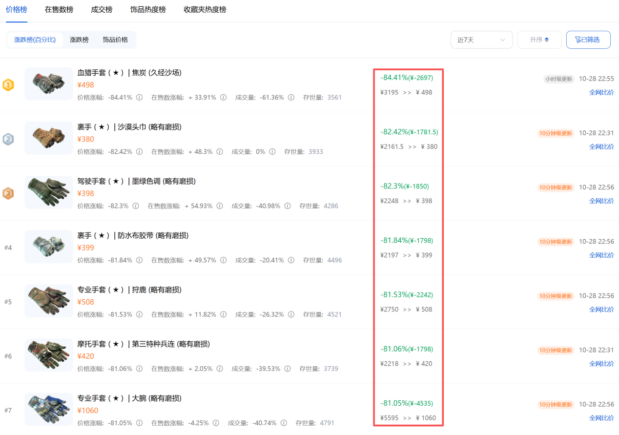 一些高端饰品的价格崩盘则更为凸显。例如游戏中一款名为“潘多拉之盒”的运动手套,10月22日的平均价格还在60900元,10月24日就跌至12325.34元的低点,跌幅达到79.76%。
