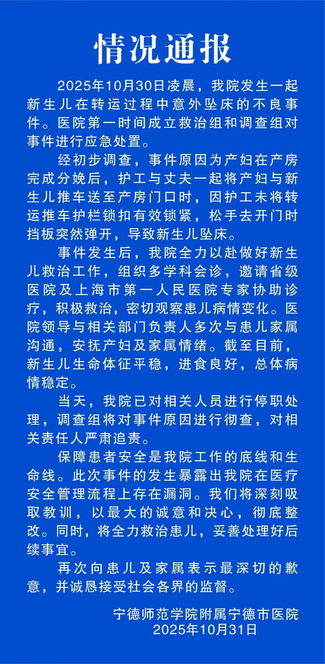 10月30日,清晨5时14分许,福建宁德师范学院附属宁德市医院,一名产妇在完成分娩后,与新生儿一同从产房转送至病房的途中,疑似因推车护栏未锁紧,就在护工松手的瞬间,推车一侧护栏突然打开,新生儿从车上坠落地面。