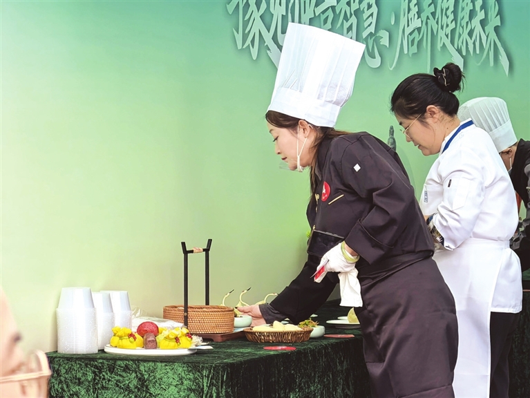 ⑤10月23日,在南阳医圣文化园,工作人员正在将制作好的药膳装盘进行展示。