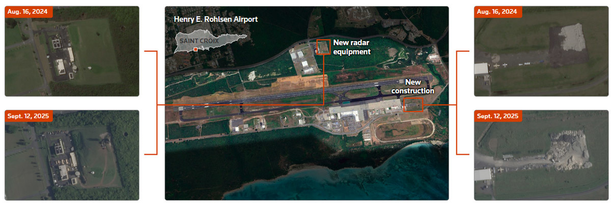 与此同时,在美属维尔京群岛的圣克罗伊岛,9月和10月拍摄的卫星图像显示,美军正在改建岛上的亨利·罗尔森机场的停机坪。美国官员透露,改造后的停机坪可以让更多美国军用飞机停靠和加油。
