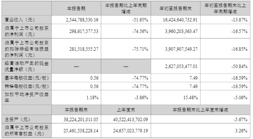 今年第三季度,古井贡酒单季实现营业收入25.45亿元,同比下滑51.65%,实现归属于上市公司股东的净利润2.99亿元,同比下滑幅度达到74.56%。