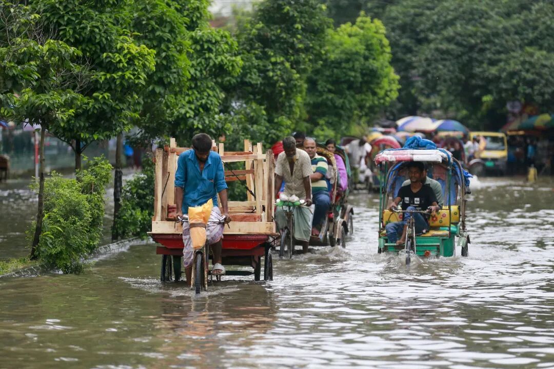 9月22日,孟加拉国达卡市遭遇暴雨袭击,车辆在积水的街道上艰难行驶。