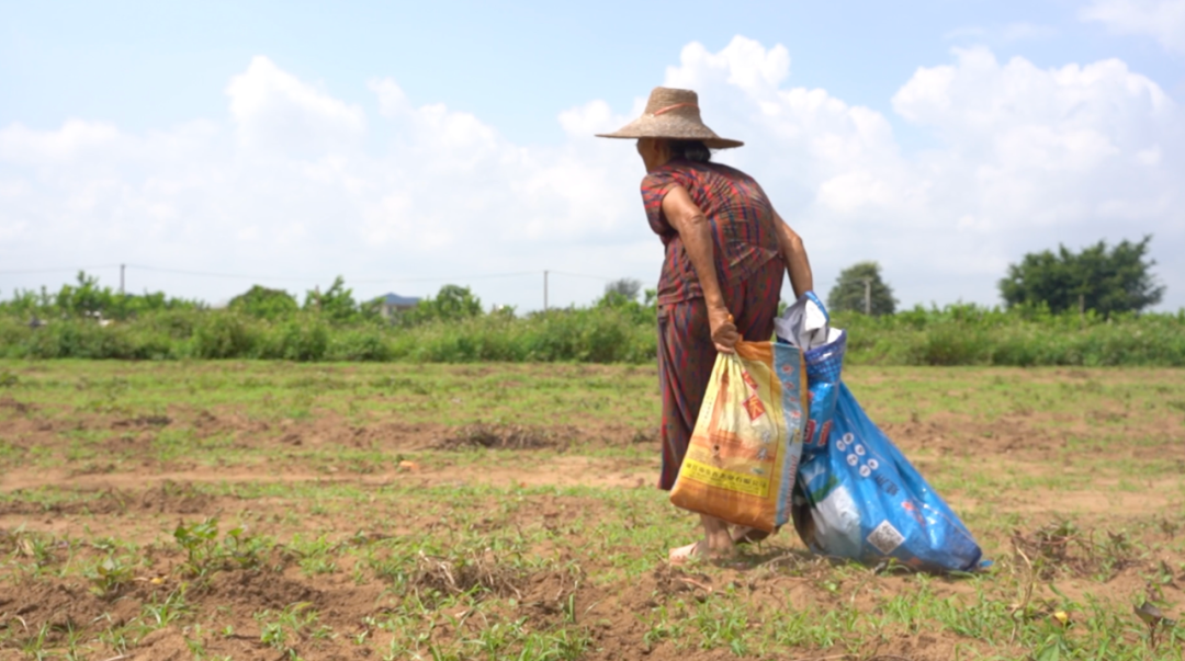 但是,总会有一些埋在地里的小番薯被落下,老板不会再专门雇人去收集,因为人工费划不来,所以一般都是村里的老人过来捡拾。我印象最深的是这一位,她已经80多岁了,已经驼着背,但还是提着两个化肥袋在那里挖番薯。
