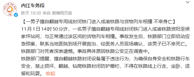 11月1日14时50分许,一名男子擅自翻越专用线封闭铁门进入成渝铁路资阳至侯家坪站间,与正常通过该区间的货物列车相撞。事故发生后,铁路部门立即启动应急预案,联系当地医院到场开展救治,经医务人员现场确认,该男子已不幸死亡。铁路部门对死者深表遗憾。事故具体原因铁路公安正在调查中。