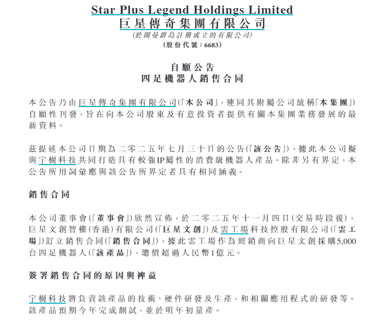 【大河财立方消息】 11月5日早间,巨星传奇在港交所公告,旗下公司巨星文创智权(香港)有限公司与云工厂科技控股有限公司签订销售合同。云工厂作为经销商向巨星文创采购5000台四足机器人,总价超1亿元。