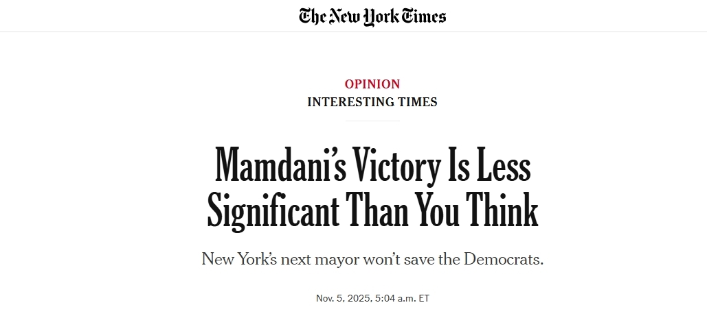美国《纽约时报》11月5日发表题为《马姆达尼的胜利没有你想象的那么重要》的文章称,纽约下一任市长并不能拯救民主党。