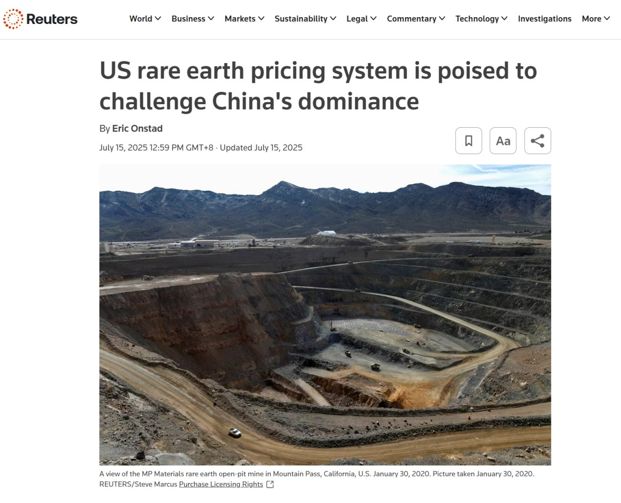 兵马未动,粮草先吃饱了。路透社对这笔股权收购的形容是“美国稀土定价体系蓄势待发,挑战中国主导地位”。只能说,你开心就好……