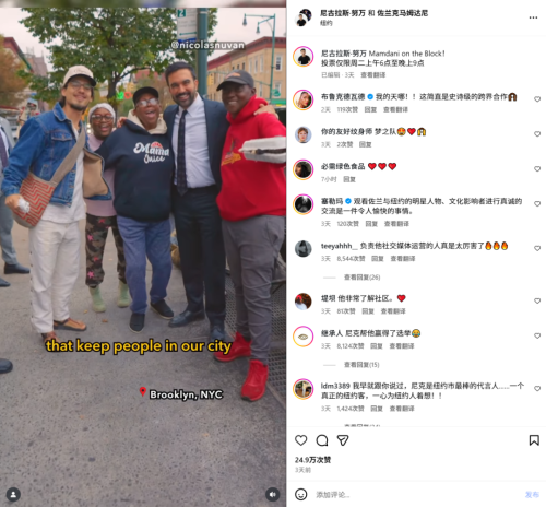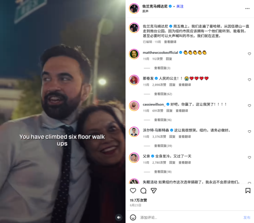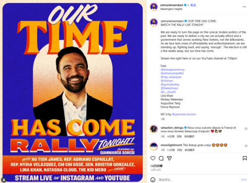 身为大导演之子的马姆达尼,在社交媒体和短视频当道的时代,将信手拈来的媒体技巧发挥到最大化,是个粉丝百万的政治网红,深得纽约Z世代年轻选民喜爱。这也是依赖传统竞选广告的67岁对手科莫玩不过的领域。
