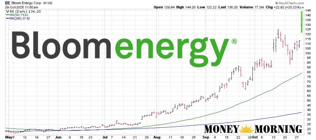 美股有个股票,叫Bloom Energy(BE),今年暴涨五倍。这家公司是设计和制造固体氧化物燃料电池的,这些燃料电池可在现场独立发电,为数据中心等提供电力。