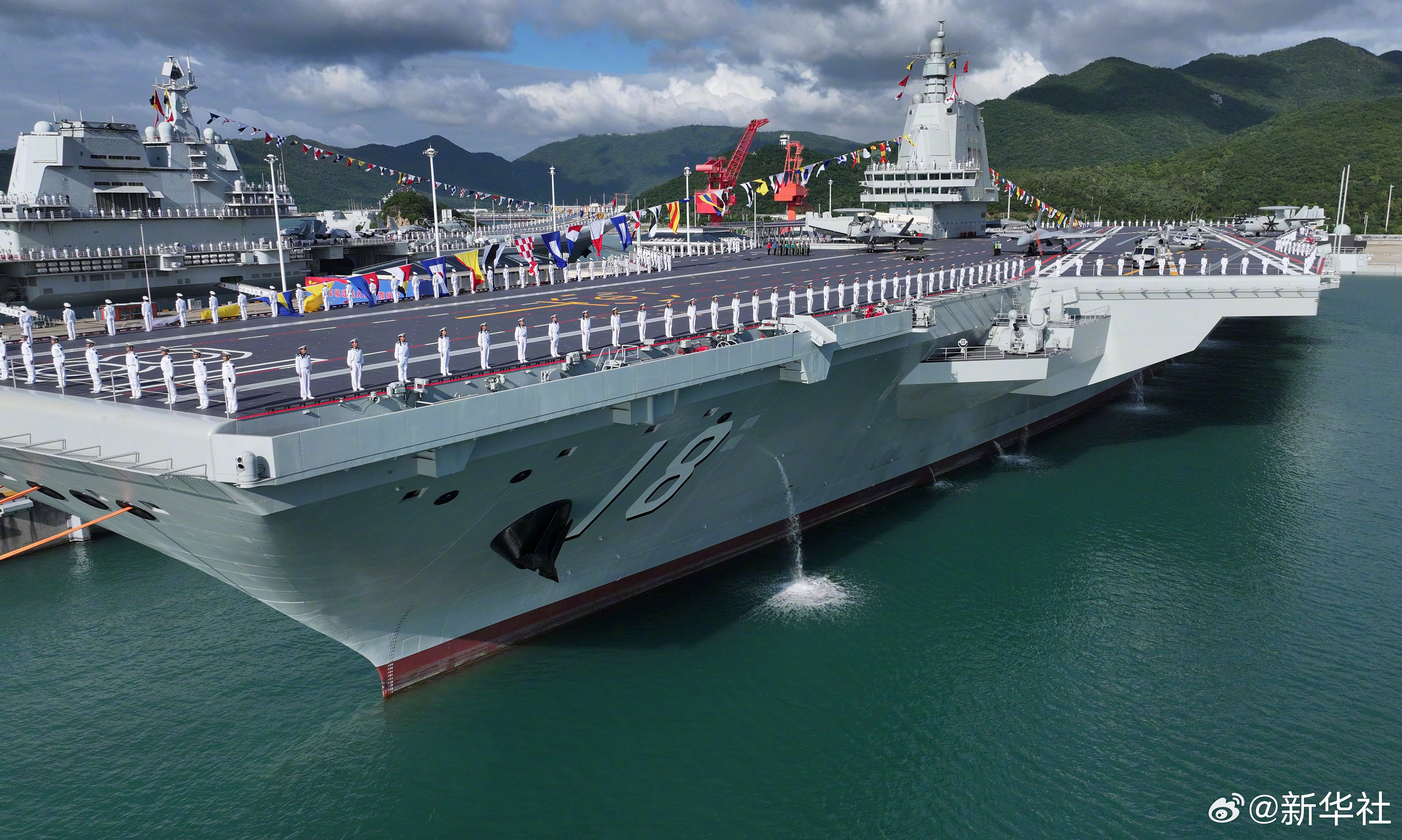 11月5日,我国第一艘电磁弹射型航空母舰福建舰入列授旗仪式在海南三亚某军港举行。福建舰是我国第一艘电磁弹射型航空母舰,也是我国第三艘航空母舰,舷号为“18”,2022年6月下水命名。福建舰由我国完全自主设计建造,其电磁弹射技术处于世界先进水平。(记者:李刚)