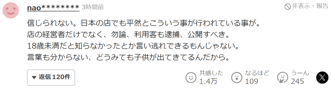 “难以置信。竟然连在日本的店里都能堂而皇之地发生这种事。不仅是店铺经营者,当然,那些顾客也应该被逮捕、公开姓名。我不知道她未满18岁这种借口根本说不过去。语言不通,一看就知道是孩子——