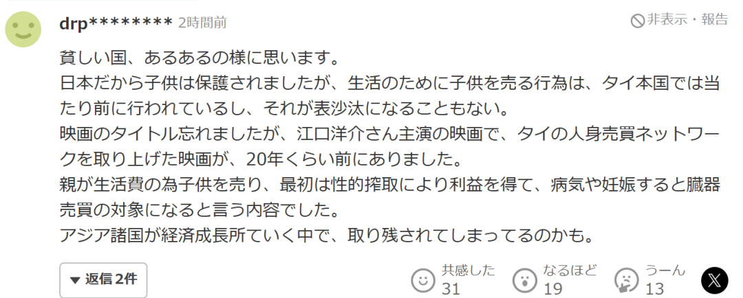 “这让我觉得,这确实是“贫困国家常见的悲剧”。只不过这次因为是在日本,孩子才得以被保护。但在泰国本国,为了生计出卖孩子的行为几乎是司空见惯的,也很少会被曝光。我忘了片名,不过大约二十年前有一部由江口洋介主演的电影,