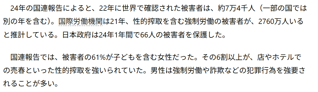 根据联合国2024年的报告,全球在2022年确认的人身交易受害者约有7万4千人。而日本政府在2024年一年中确认并保护了66名受害者。