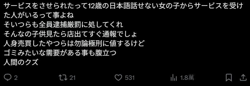 “也就是说——那个被迫“提供服务”的12岁不会日语的泰国女孩。竟然真的有客人去接受她的“服务”对吧。那些人也必须全部逮捕、严惩到底看到那种明显是小孩的情况,正常人应该立刻离开并报警才对。贩卖人口的那些混账当然该判死刑,但更让人愤怒的是,居然存在这种需求。真的是人渣,连人都不配称。”