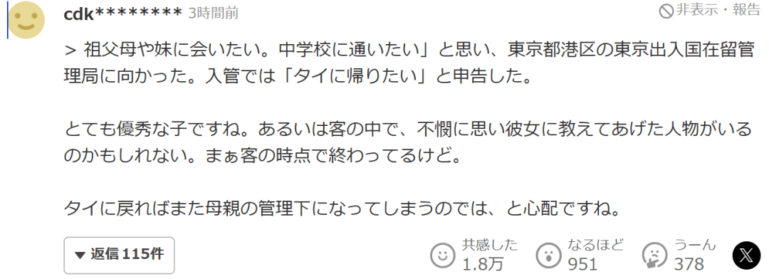 “她说想见到祖父母和妹妹,想去上中学,于是前往了位于东京都港区的东京出入国在留管理局,并在那里表示“我想回泰国”。