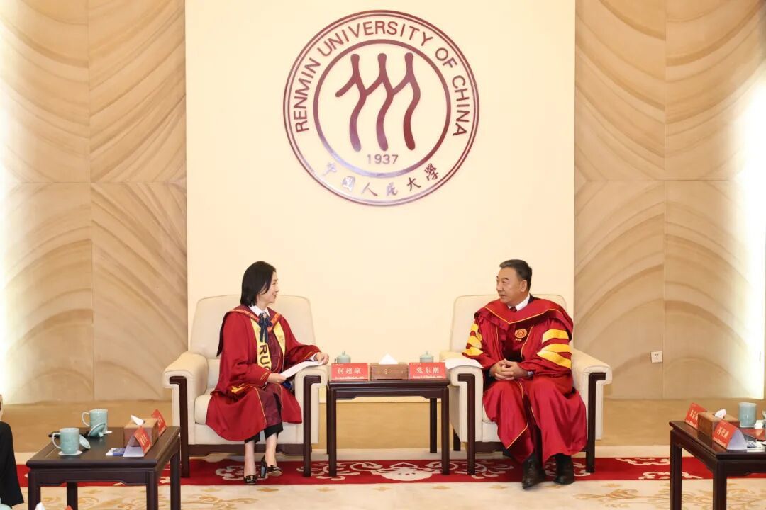 ▲中国人民大学党委书记张东刚为何超琼女士颁发学位证书、拨穗。