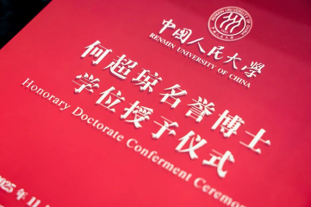 张东刚在致辞中表示,何超琼女士是爱国爱港爱澳的杰出人士,是粤港澳大湾区融合发展、创新发展、改革发展的创新力量,也是富有情怀的艺术、文化、旅游事业产业推动者。中国人民大学有着光荣的办学传统和红色基因、优秀的艺术教育传统和学科基础,名誉博士不仅是学术桂冠,更承载着“让党放心、不负人民”的精神品格、“独树一帜、勇走新路”的高远追求和“扎根中国、胸怀人类”的世界情怀。授予何超琼女士名誉博士学位不仅是对她卓越成就的崇高致敬,更是对她与人民大学“精神同频、价值共振”的高度认同。期待与何超琼女士及港澳各界同仁一道,坚持为国育才之本、拓展文明交流之界、紧跟国家战略之需,学习好贯彻好党的二十届四中全会精神,为全面建成社会主义现代化强国、实现第二个百年奋斗目标贡献教育力量、知识力量、人才力量。