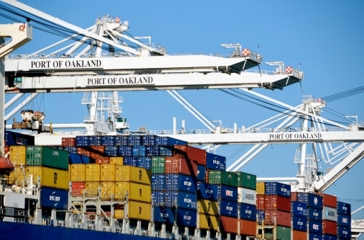 满载集装箱的货船停靠在美国加州奥克兰港。 奥克兰港网站