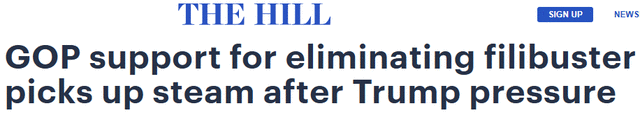 川普的施压已经改变了一些共和党参议员的立场。例如来自阿拉巴马州的参议员汤米·图伯维尔(Tommy Tuberville),他在去年的共和党参议院领导层选举中曾明确表示希望保留阻挠议事制度。