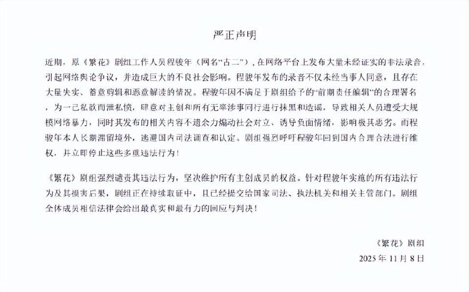 11月8日,电视剧《繁花》剧组再次发文,回应原剧组工作人员程骏年(网名“古二”)发布录音引发争议一事,称录音存在大量失实、蓄意剪辑情况,剧组正取证并已提交相关部门,相信法律会给出最真实和最有力的回应与判决。
