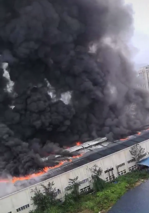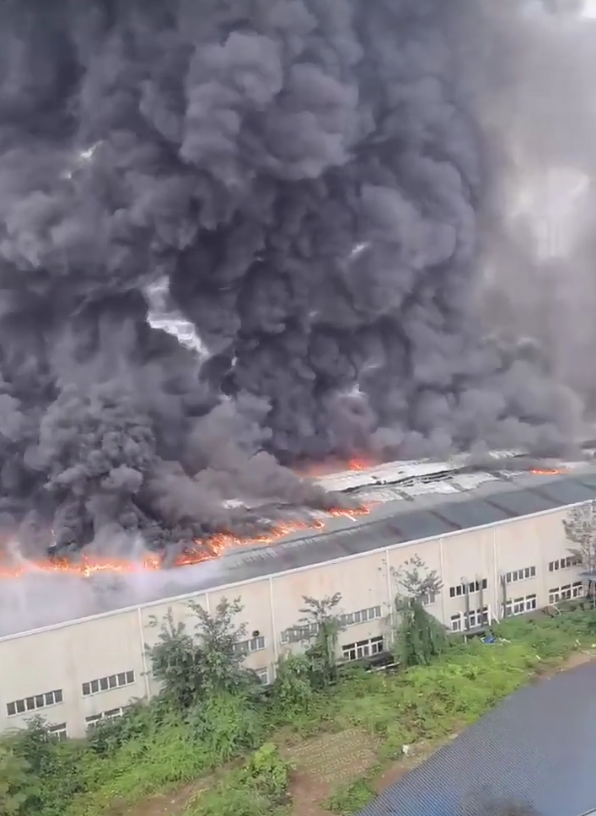视频中的画面显示,一厂房上方大面积起火,现场浓烟滚滚,腾起的黑烟如“瀑布一般”。据了解,距离工业园约100米还有居民楼。